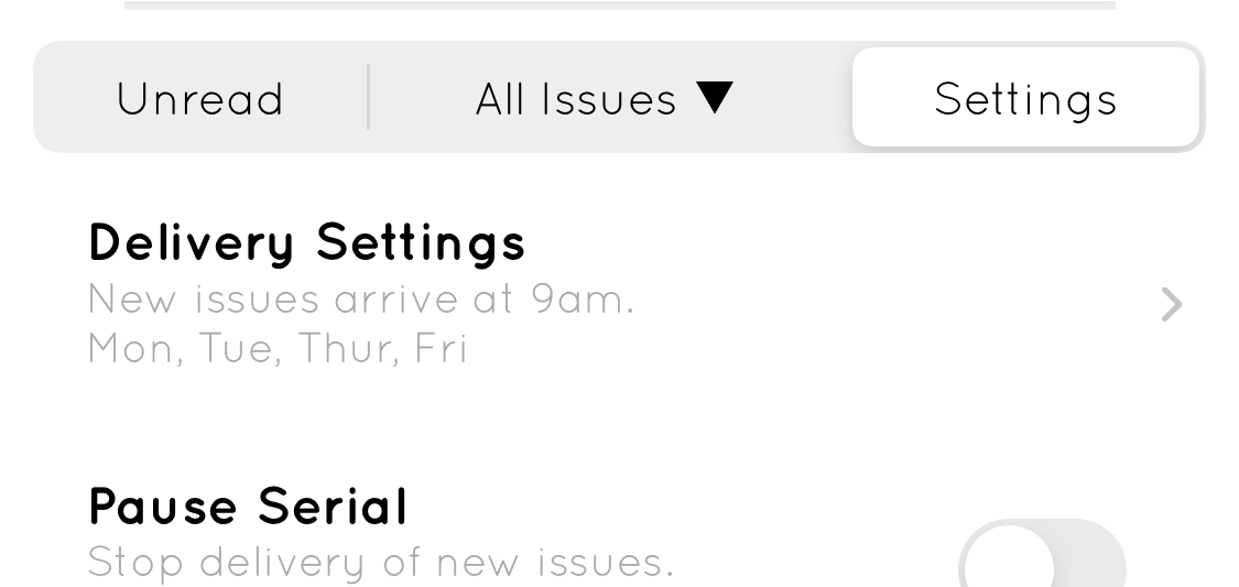 Not only that, but with version 4.0 of Serial Reader you can also now set custom delivery days for specific books. This lets you configure which days and which hour you want to receive new issues for particular books. Want to only receive new issues on weekends? Every other day? Now you can! Select which hour and days you want new issues for each subscribed book with Serial Reader's iOS version.